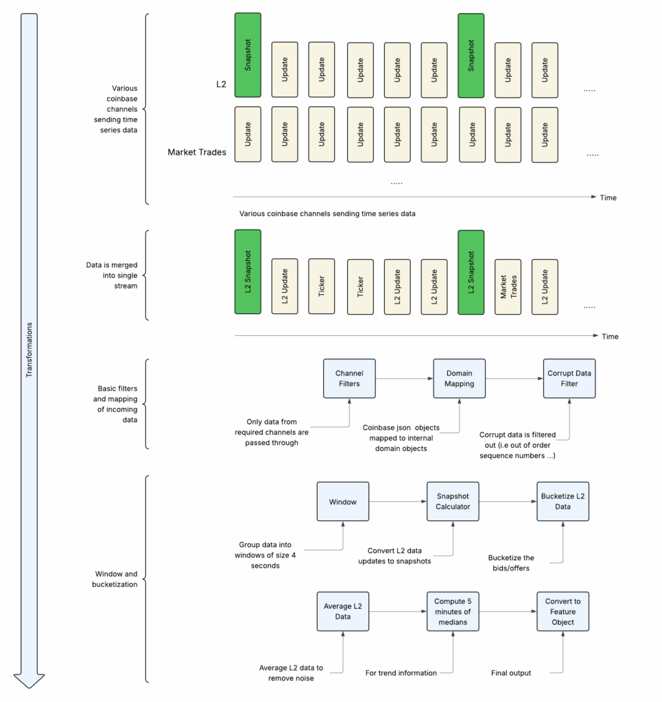 The data that arrives from Coinbase needs to be transformed before it can be used within the ML models.