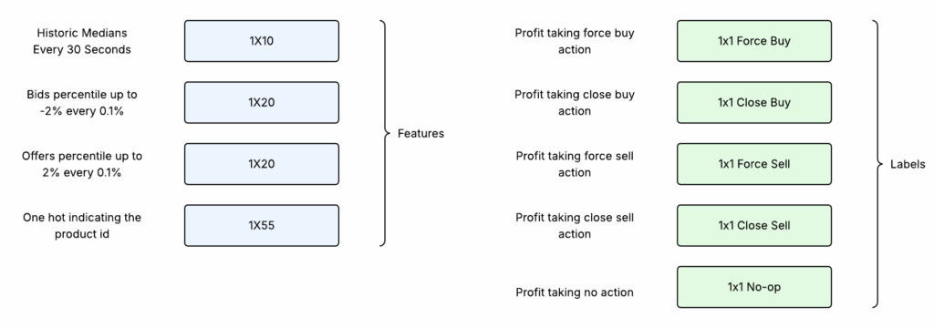 - Offers/Bids: Each a 1×20 tensor. Coinbase provides a snapshot of active bids/offers along with changes to the order book. At every record bids/offers 2% below and above the median respectively are bucketized into 0.1% increments. The percentile of bid/offers in each bucket is calculated and normalized and used as input features