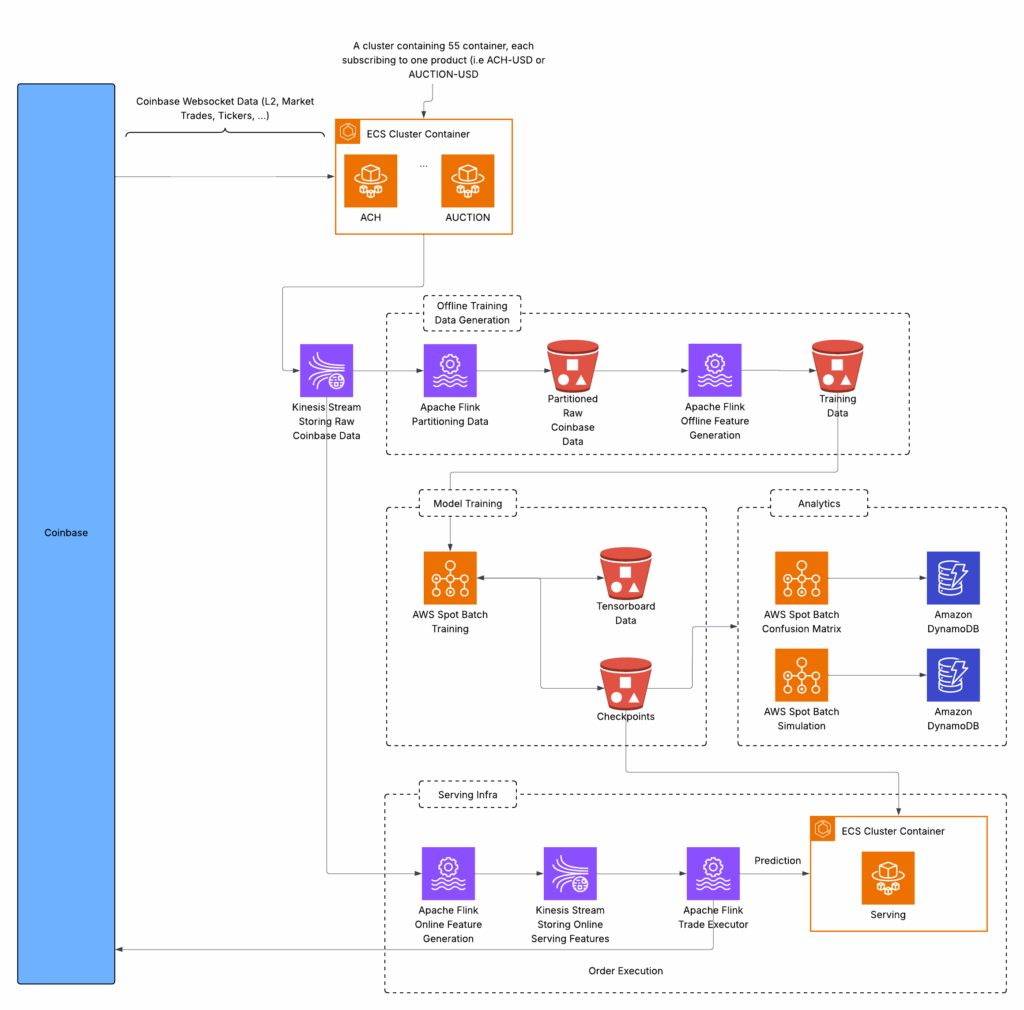 - A second apache flink application reads from the second kinesis stream and sends the features to the prediction model which is being served in an ECS cluster. After it receives predictions it will determine the optimal action and execute on it. The optimal action takes into into account existing buy/sell orders and the available reserves (coins, USD)