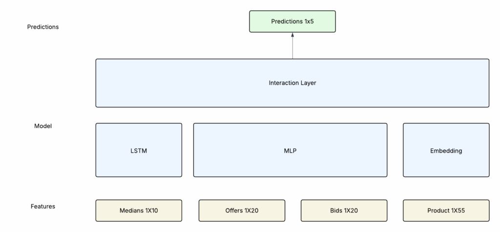 - Interaction Layer: Another MLP applied to the outputs of the LSTM, Bid/Offers MLP and embeddings and is used to generate the output predictions